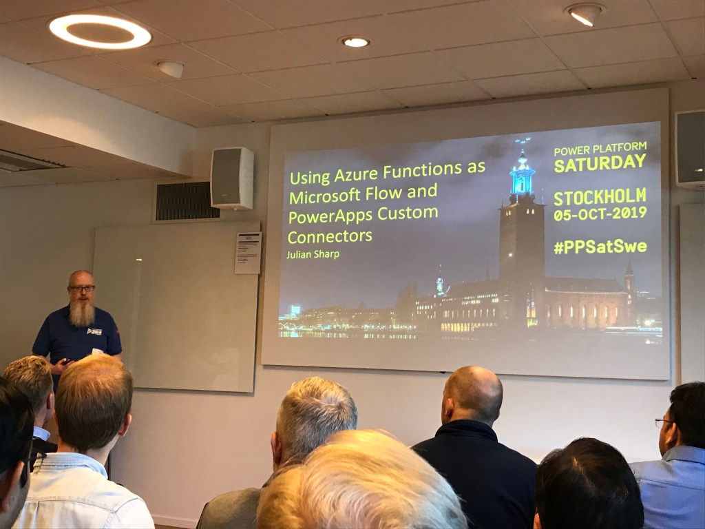 First up after lunch was Julian Sharp and “Using Azure Functions as Microsoft Flow and PowerApps Custom Connectors.” Sounded techy and fun, could not miss that! Really great stuff he had there, guiding us through how to create an Azure Function, use a web hook, create a Custom Connector which then can be used in PowerApps and Flow. Interesting with Webhook to Azure Function. According to Julian that is the future. I should look more into that.