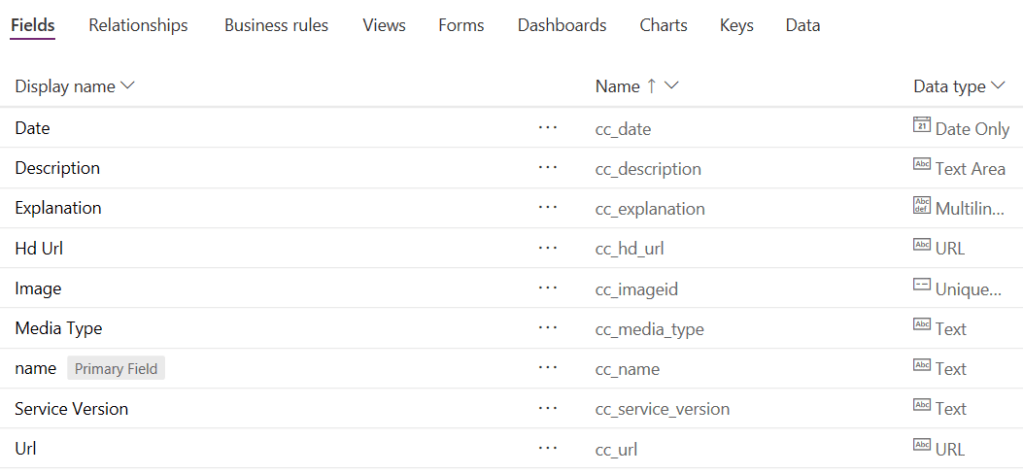 For about a week ago I had some fun exploring one of Nasa’s Open APIs, Astronomy Picture of the Day. I made a Canvas App which displayed the picture of today (with a Microsoft Flow in the background). As a separate thing I also created a Microsoft Flow which I scheduled to run each day, it gets me the picture of today and saves it as a record in the Common Data Service. Before I set up the flow I created an entity to hold this information. This blog post will let you in on how I set up the flow which creates CDS records and how to display the records in a Model-Driven App.