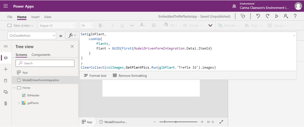 Below is how the end result looks like. To the right we have an embedded Canvas App displaying images from the Trefle API. The data displayed in on the left section on the General tab is data located in the Common Data Service. When the embedded Canvas Apps loads, a flow is triggered and takes the Trefle Id from the record, asks the API for the images for that plant and returns it to the embedded Canvas App. The tricky thing here was that the ModelDrivenFormIntegration did not get me the Trefle Id at first. Read on – and I’ll tell you some work-arounds for it.