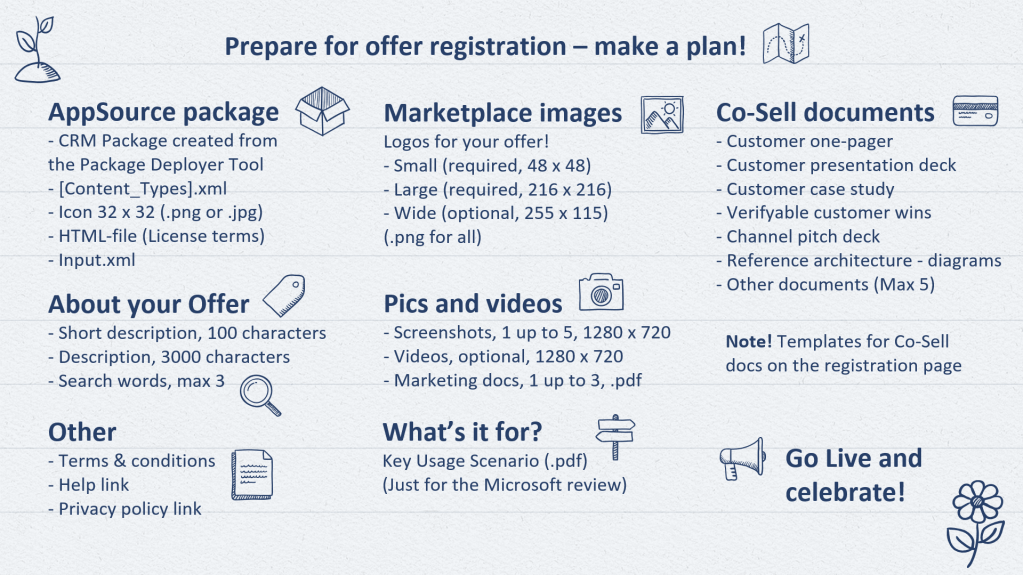 Before you create your offer in Partner Center, you should have prepared the different parts that you will need to fill in or upload. Different offer types require different preparations. I have written about this before in this article, but now I have also put together a summary picture for what you should prepared when registering a Dynamics or Power Apps offer. What is new here is to prepare Co-Sell documents, which is a part that comes with the ISV Connect program.
