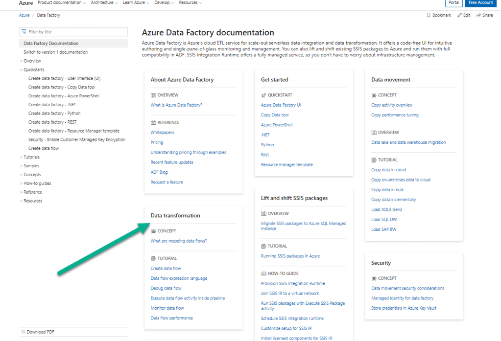 Read more about Azure Data Factory in the Microsoft Docs and take a look at how to create an Azure Data Factory Data Flow here. You can also read the Azure Blog post announcing GA for ADF Mapping Data Flows here and you can find a lot of other great links here.