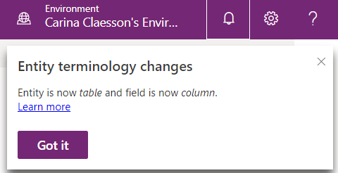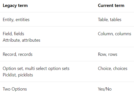 A lot has happened during this time (a whole journey to the cloud) but we have always had Entities, Fields and Records. Don’t get me wrong, I do not want to go back, I really like it where we are, we have so much more possibilities nowadays when designing solutions. I’m just being a bit nostalgic. When I have gotten used to it, I will speak more like our customers I assume, after all Microsoft mentions in the terminology update section that they have taken into account the feedback from the customers.