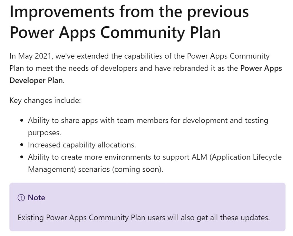 We have had the possibility to create what has been called a Power Apps Community Plan, which has given us a free individual environment with some limitations, e.g. no sharing with others. This Community Plan will be re-branded to Power Apps Developer plan. Great news includes that we will be able to share apps for development and test purpose as well as we will get additional environments and hence possibility to practice our ALM skills. If you have had a Community Plan you will keep this and you will also get the updates.