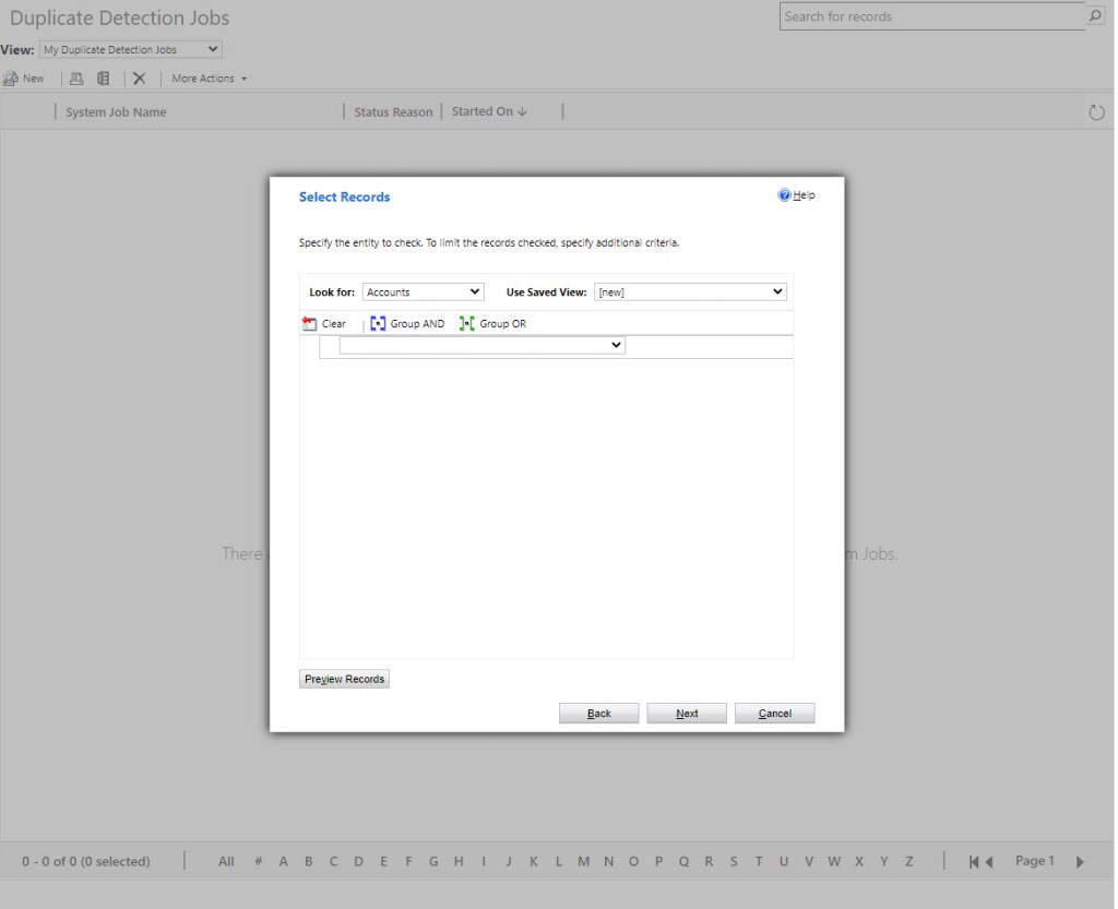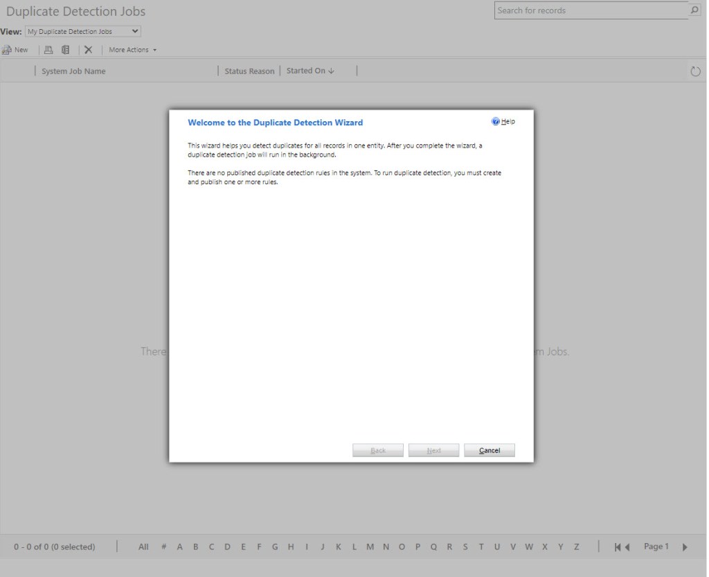 Go to Admin Center, Environment, choose your environment and Settings. Choose Duplicate Detection Jobs under Data Management. You will need to have Duplicate Detection Rules set up before you can run a Duplicate Detection Job. Once you have rules set up, you can follow the wizard and create a job which looks for duplicates. (Do a sneak peak at step 2 if you’re new to those rules).