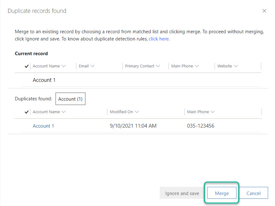 Users will also reach the Merge functionality when a Duplicate Detection Rule kicks after the user tries to create a new row of a certain table, for which there is a Duplicate Detection Rule, and the platform detects that the user tries to input what the platform define as a clone. The user then gets a warning about a possible duplicate.