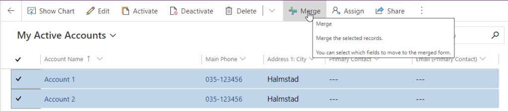 - The Merge option is available only for Account, Lead, and Contact entities.