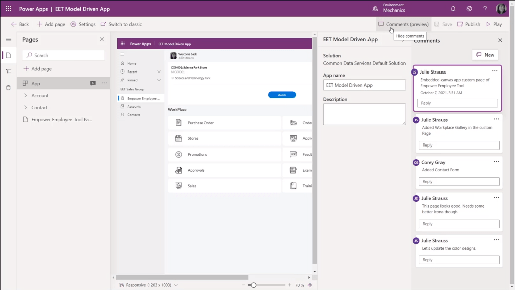 - Collaborate while building apps – E.g. use comments while creating your Power Apps apps