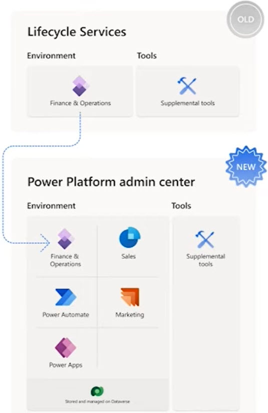 Below is a picture from the Tech Talk One Dynamics One Platform. It illustrates how we today have the OLD way and the NEW will be when F&O environments are managed in PPAC, together with our other environments in which we have Dynamics 365 Sales, Marketing, Service, custom Power Apps and Power Automate cloud flows.