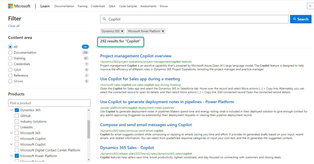 Let’s first check what happens if we search for Copilot. The Microsoft Learn teams have been busy, 2282 hits.