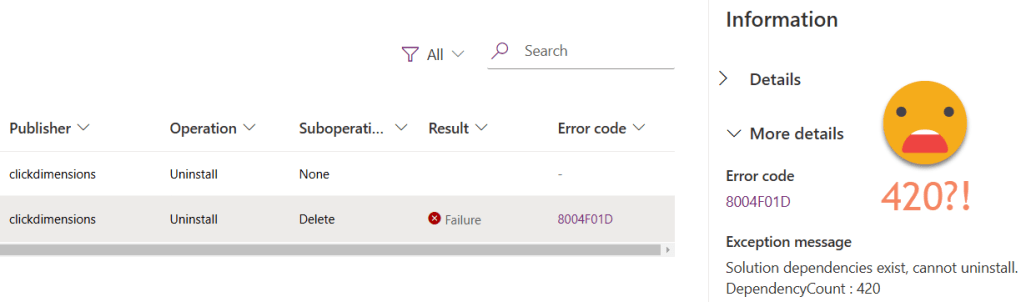 As the unofficial HTTP response status code says 420 – Enhance your calm. That’s exactly what’s needed when faced with an error message telling you there are 420 dependency issues to solve! Mixed third-party solution components and your own, wonderfully tied together. Better put the Sherlock hat on and dig into the details if you want to succeed in deleting that solution!